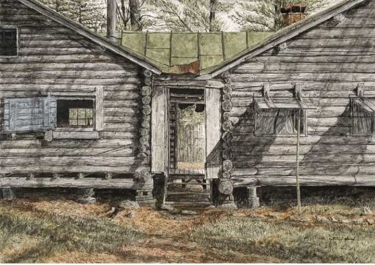 In a print of one of his pieces we bought – “Breezeway” – he used stones from the lake-shore, a charred piece of the cabin, and handmade lead white carbonate to depict the 120-year old log cabin.