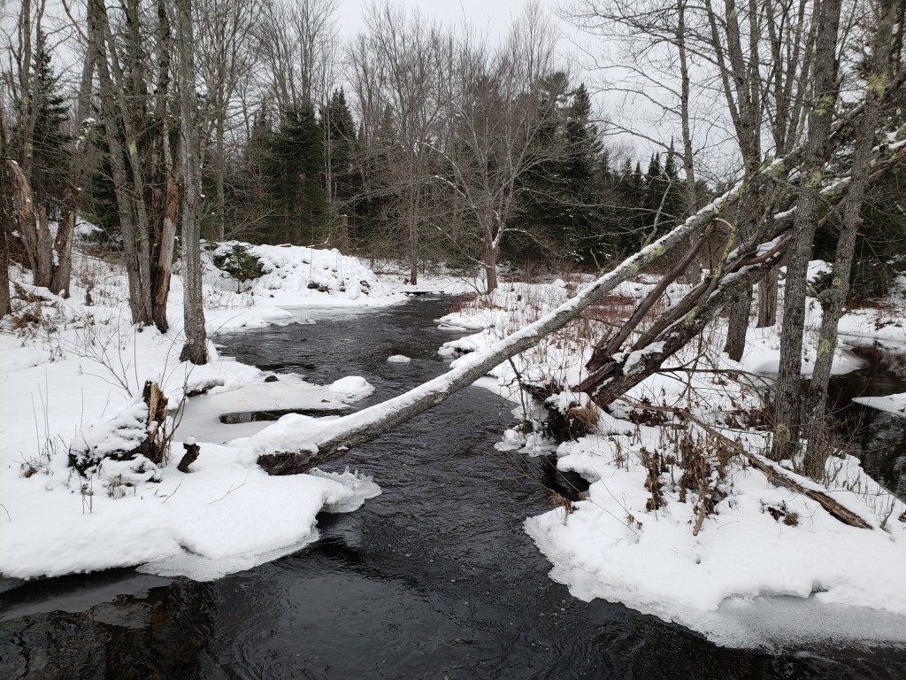 We dropped in on Nathan on the way back from Waterville where Sandy came along to visit the Colby Museum while I taught my last class of the semester. Just before finding the turn onto the dirt road leading down to his home, we had to stop to capture this lovely image (above) of a snowy woods sliced by an icy black stream…