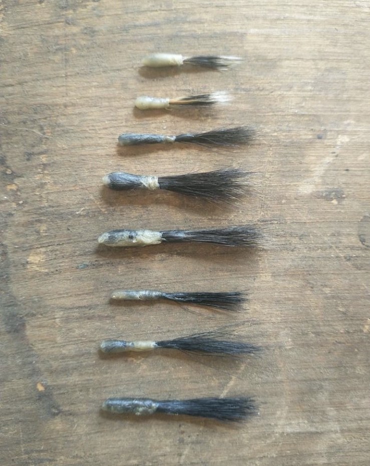 Nathan’s brushes are made with feather quills from the right wing of the the bird, so that the curve fits over his right hand – as well as with quills from animal furs Allard’s friends bring him. Some come from hunting trips and others from the side of the road. The hair bristles in his brushes are from moose, flying squirrel and other Maine indigenous critters.